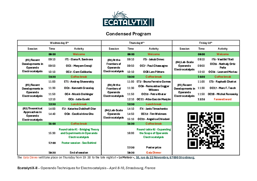 Following the success of the EcatalytiX conference held in April 2024 in Strasbourg, France, EcatalytiX II will take place from April 8th to April 10th 2026, in Strasbourg. Its core objective is to take a look at the current and future techniques based on X-rays, visible, infrared or electron beams used to observe electrocatalytic reactions under conditions as close as possible to operation. Gathering scientists from all over Europe, the meeting wishes to shape directions to answer some of the following questions: